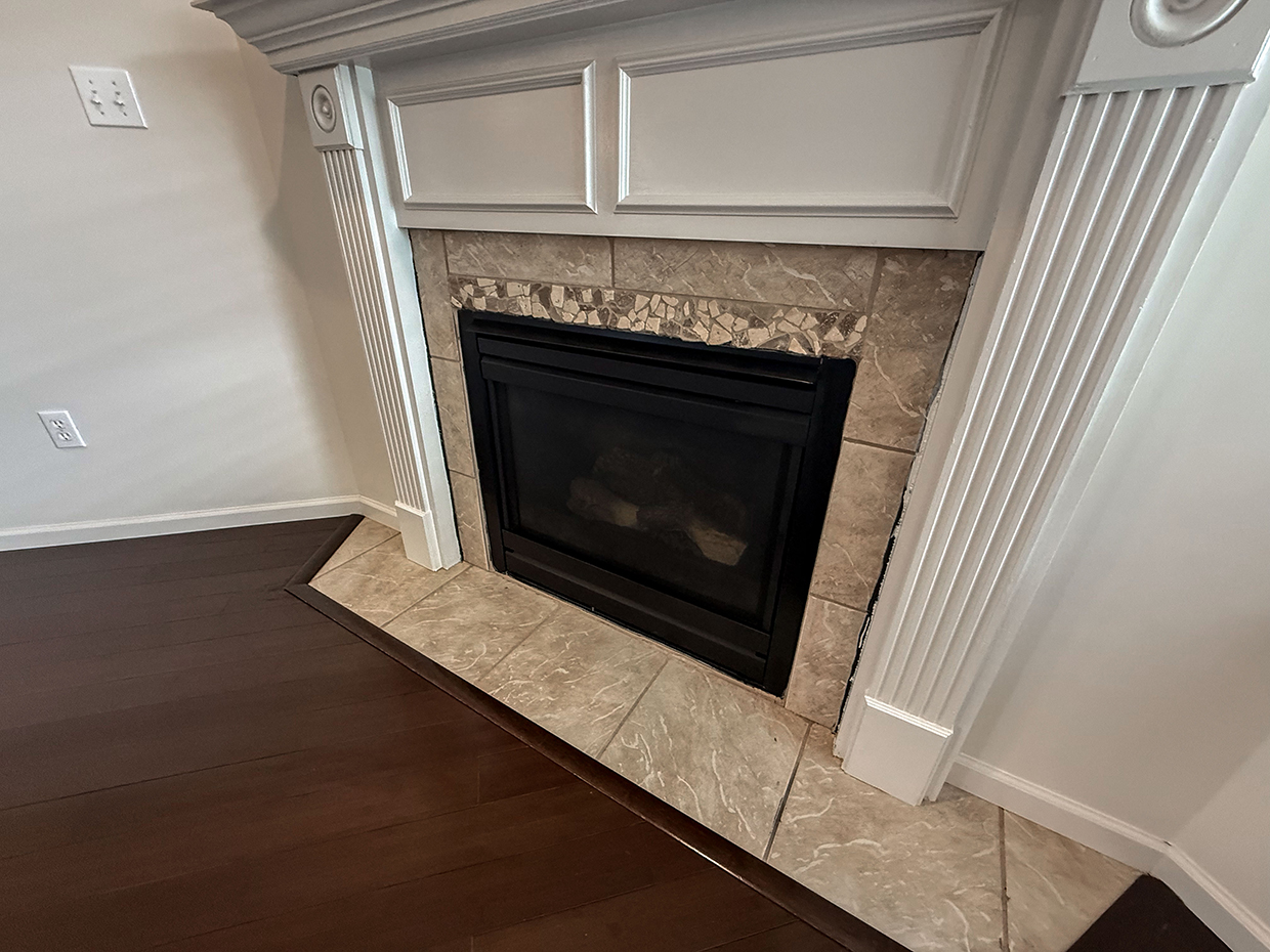 The living room includes vaulted ceilings, bamboo flooring, and a cozy gas fireplace. Large windows allow natural light to fill the space. Therefore, it creates a comfortable area for everyday living or entertaining guests.