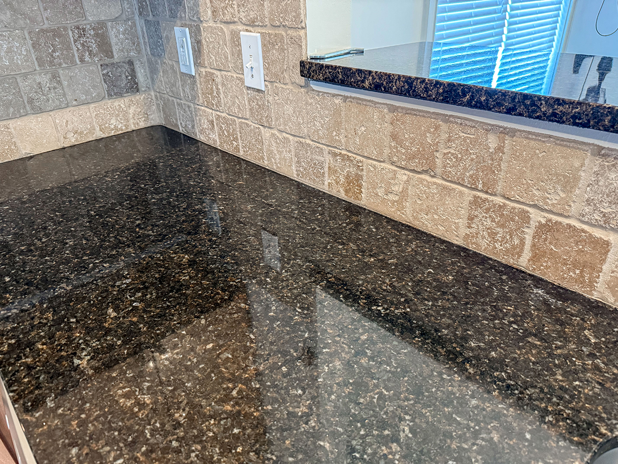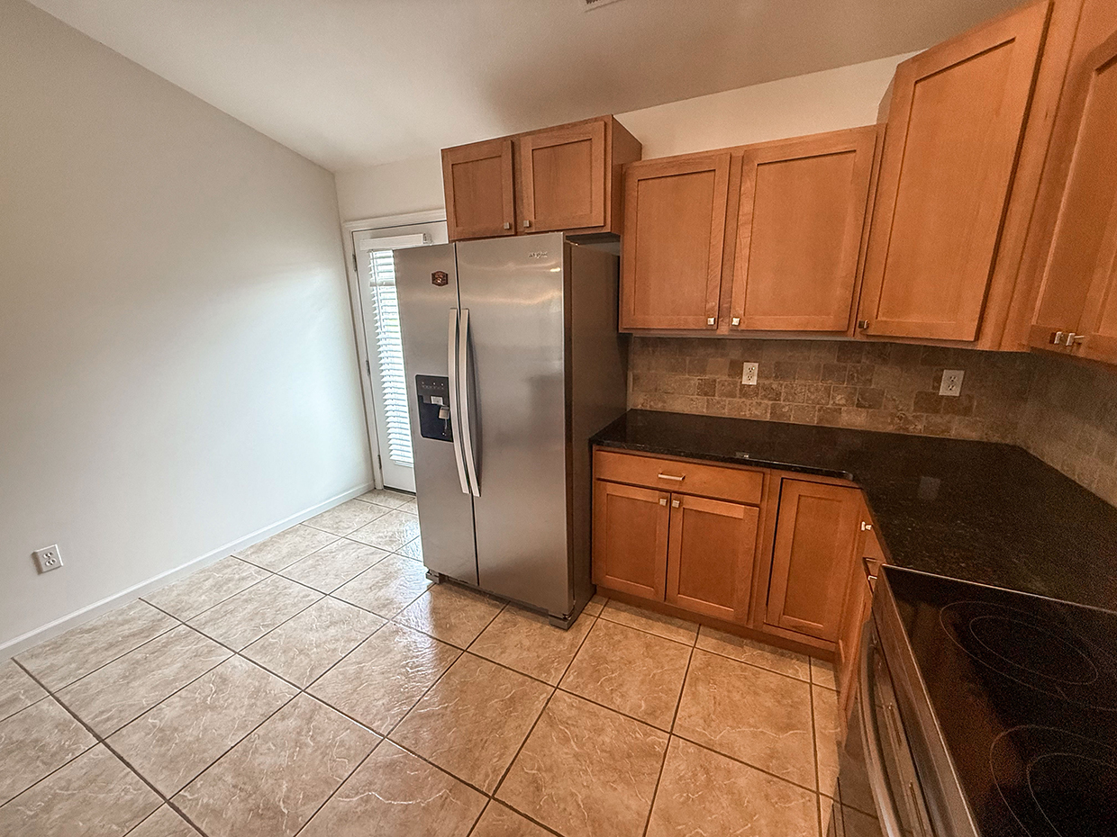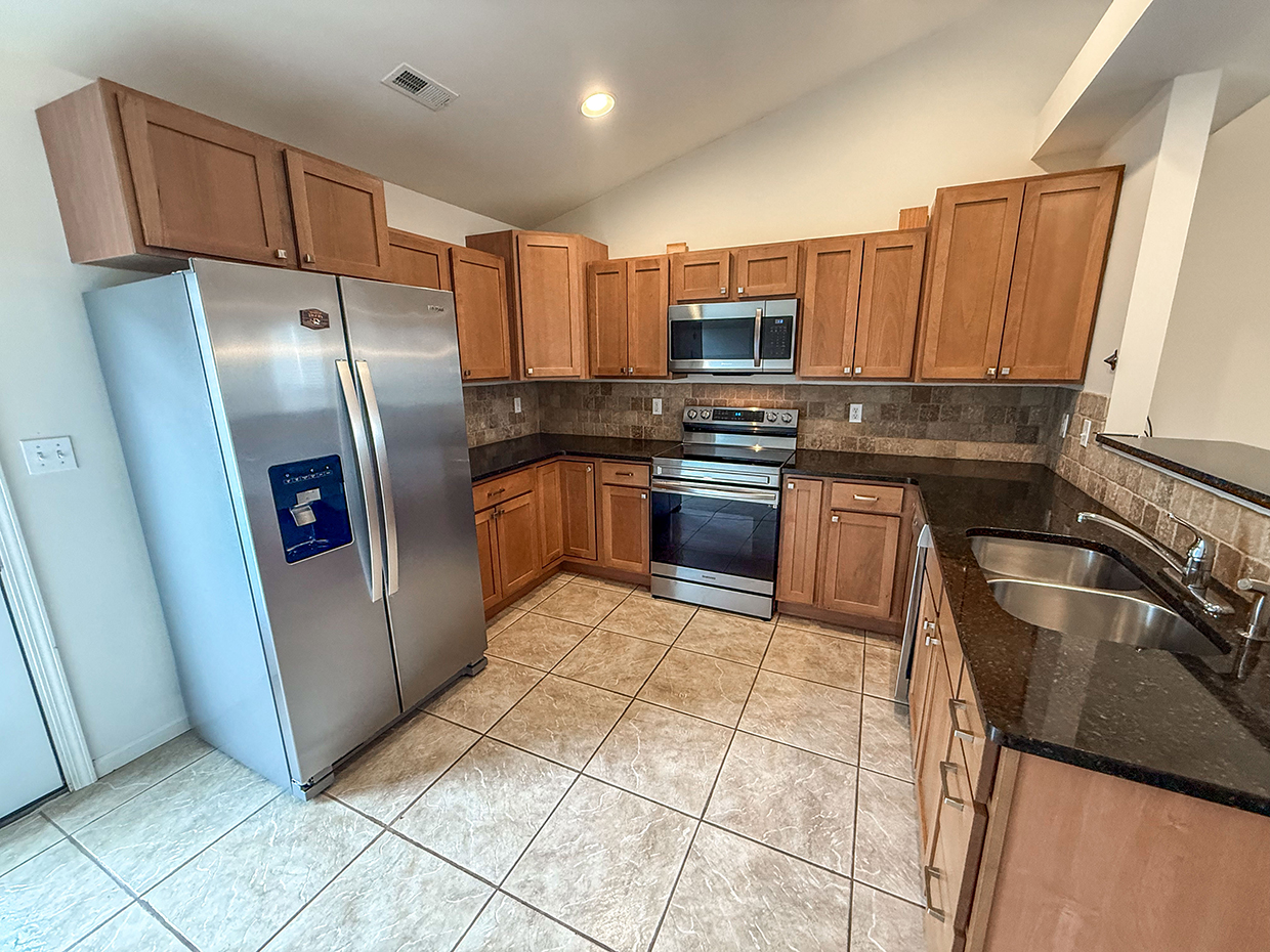 The kitchen sits at the center of the home and features granite countertops, wood cabinetry, and modern appliances. In addition, the layout offers plenty of counter space for preparing meals and gathering with family or friends.