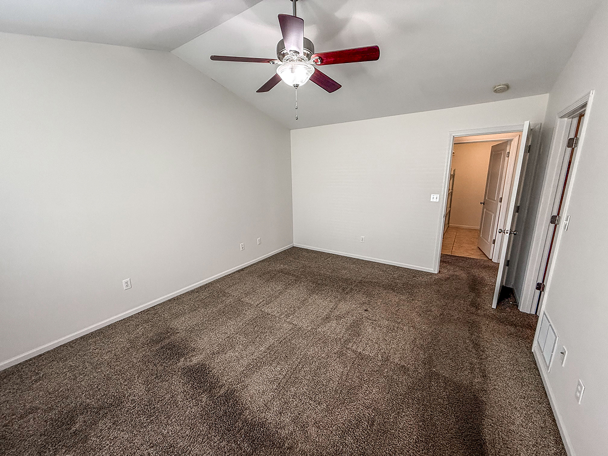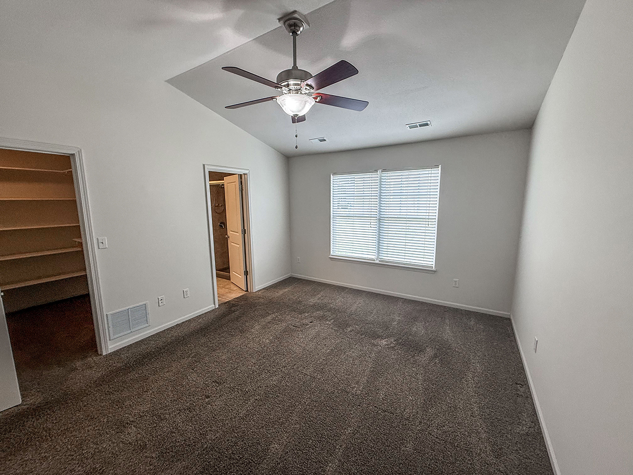 The primary bedroom offers a relaxing retreat with vaulted ceilings and plenty of space. It includes a large walk-in closet and a private bathroom designed for comfort and convenience.