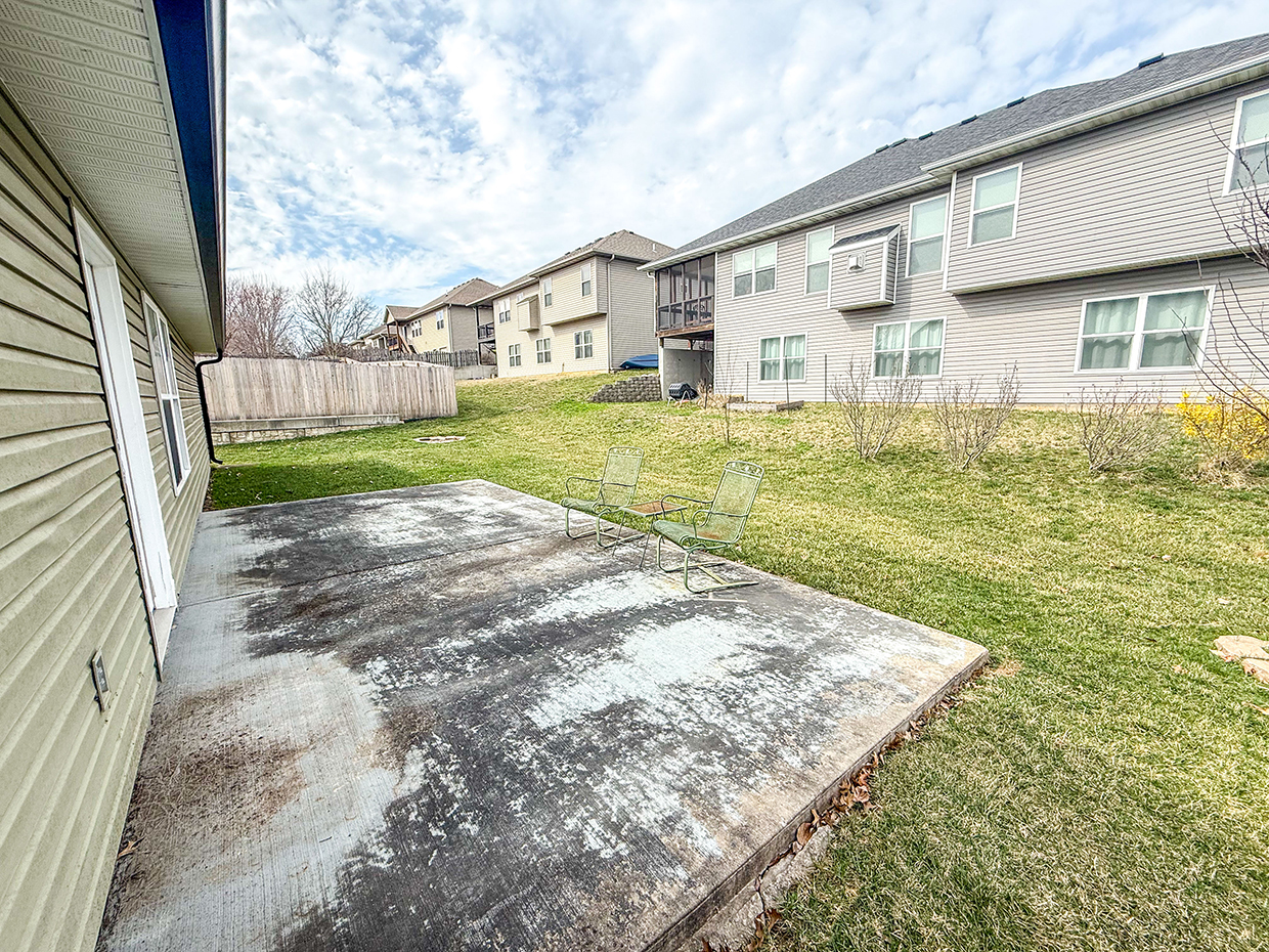 The patio area offers plenty of room for outdoor seating, grilling, or gathering with friends and family.